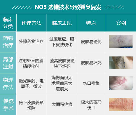 这些技术往往没有先进设备的辅助,只通过简单粗暴的形式进行狐臭的诊疗,往往导致患者术后狐臭复发、正常组织受损、上肢活动受限等等。因此,狐臭术后再次复发成为必然,复发率高达85%